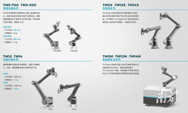 据了解,达明机器人提供了多种系列的协作机器人解决方案,一种是常规负载系列(TM5系列),适用电子业、半导体业、食品加工业等;一种是中高型负载系列(TM12、TM14),适用面板业、金属铸造加工业等;还提供无视觉系列以及高性能移动系列产品,分别适用于有特殊定制要求和移动堆栈或具有机动性等应用场合。 “这些系列代表不同的臂长大小和有效载荷重量,以满足工厂内各种任务和需求。”达明机器人相关负责人介绍道,“粤港澳大湾区是机器人企业的聚集地,同时在大力推动制造业智能化,希望达明机器人能助力大湾区企业更快实现智能制造。” |