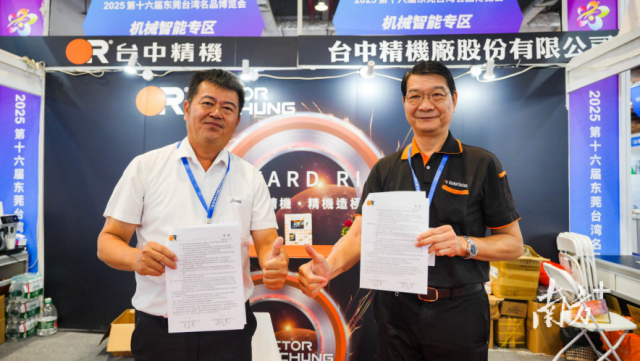 首次参展台博会签约百万订单,台中精机大秀科技肌肉来源:南方+ 9月12日,2025年第十六届东莞台湾名品博览会(下称“台博会”)在厚街广东现代国际展览中心火热进行中。当天上午,台中精机厂股份有限公司(下称“台中精机”)与信易电热机械股份有限公司(下称“信易电热机械”)达成合作,现场签约118万元订单。