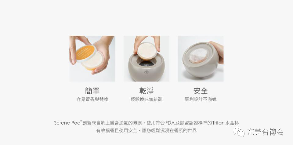 b. 香氛胶囊系统 全球独家专利发明─Serene Pod® System香氛胶囊系统,胶囊蜡的透气膜可阻挡蜡液溢出又具高度透气,与国际香水大厂精心调制的各种缤纷色彩香氛,随心所选,让生活更有情趣。 c. 雾化系统 超声波雾化技术,采用超声波雾化片+精准高频电流,在雾化机内部,通过增幅放大后的高频超声波振动将液体雾化,使香氛精油快速均匀扩散到空间中,同时释放大量负离子,让空气更清新,随时享受芬芳空间,感受生活中的宁静之美。