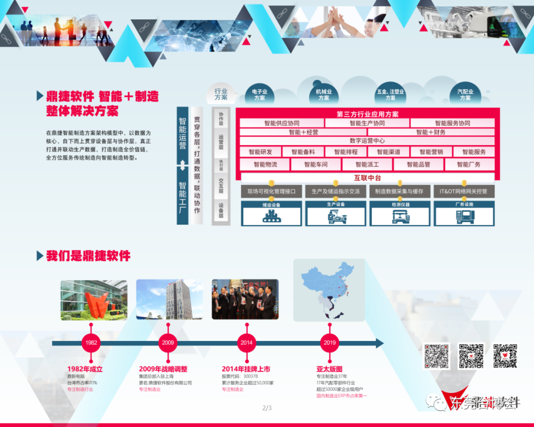 2014年1月,鼎捷软件股份有限公司在深圳交易所创业板正式开始挂牌上市(DigiwinSoft,股票代码:300378),公司跨入全新发展阶段。2020年7月,本着对“创造客户数字价值”的一致认同,公司引进富士康工业互联网股份有限公司(简称“工业富联”,股票代码:601138)成为新的战略投资股东,借此公司在智能制造与工业互联网的布局得以进一步完善,以持续推动IT与OT的创新融合,打造更加成熟的智能工业系统,助力我国制造产业的数字化、智能化转型升级。立足大陆,辐射亚太,公司已发展成为覆盖台湾地区、越南、马来西亚等多个国家与地区,拥有36家集团分公司与子公司,33个国内分支机构的国际化运营集团企业。